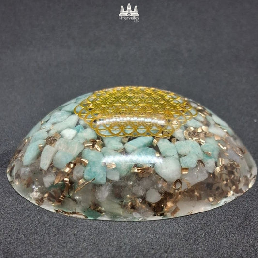 NOUVEAUTE Dôme Orgonite Symbole Fleur de Vie , Amazonite et Quartz Rose
